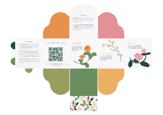Branding and packaging design for a fictional sustainable skincare brand, Petal & Bloom